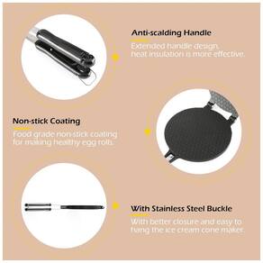 A Máquina para Waffle Cone Dyna-Living oferece alto desempenho com rápido aquecimento e geração uniforme de calor, suportando temperaturas de até 450°C, garantindo robustez e durabilidade. Seu design inclui um cabo longo que proporciona fácil manuseio, é antiderrapante e possui excelente dissipação térmica e isolamento, permitindo abrir e fechar com facilidade. Fabricada em liga de alumínio de alta qualidade, a superfície é segura para alimentos, não tóxica e antiaderente, facilitando a limpeza e assegurando a saúde para preparar cones de sorvete. Com esta máquina dupla-face, basta pressionar as duas placas para criar cones e tigelas de waffle em poucos minutos, possibilitando a produção de diversas formas e sobremesas caseiras. Ideal para café da manhã ou lanches à tarde, você pode preparar pizzas, panquecas, omeletes, cones de sorvete, tigelas de waffle, rolinhos de ovo e waffles em formato de ovo. Compatível com fogões a gás residenciais (não indicada para fogões de indução), é perfeita para uso doméstico, barracas de comida e restaurantes, além de ser uma excelente ferramenta para iniciar um negócio gastronômico.