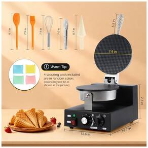 Componentes Inclusos: 1 * Máquina Comercial de Waffle Cone, 1 * Espátula, 1 * Pincel para Óleo, 1 * Pegador de Alimentos, 1 * Batedor, 4 * Esponjas, 1 * Manual do Usuário, 1 * Rolo para Cone (cores dos acessórios podem variar),