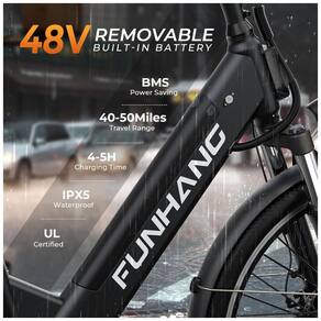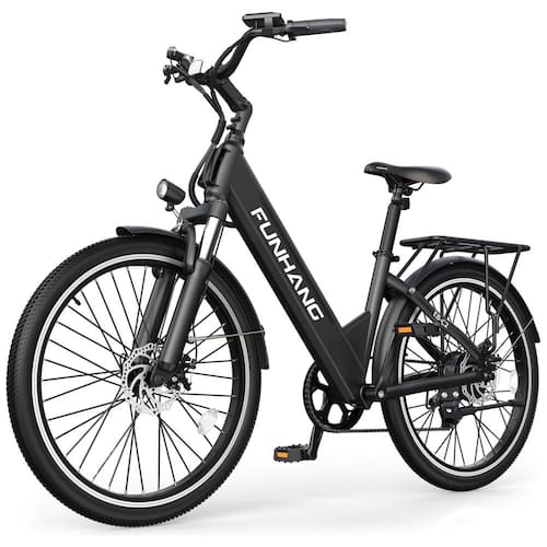A e-bike Funhang EB-C2 oferece motor 500W (pico 1000W), bateria removível de 48V, 5 modos de pilotagem, suspensão dianteira, bagageiro, freios a disco e quadro step-through. Ideal para adultos de até 136 kg.
