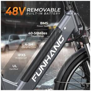 A e-bike Funhang EB-C2 oferece motor 500W (pico 1000W), bateria removível de 48V, 5 modos de pilotagem, suspensão dianteira, bagageiro, freios a disco e quadro step-through. Ideal para adultos de até 136 kg.