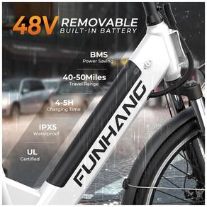 A e-bike Funhang EB-C2 oferece motor 500W (pico 1000W), bateria removível de 48V, 5 modos de pilotagem, suspensão dianteira, bagageiro, freios a disco e quadro step-through. Ideal para adultos de até 136 kg.