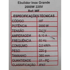 Ebulidor elétrico inox tensão 220v potencia 2000w resiswal, aquecedor portátil de água desenvolvido para aumentar a temperatura da água.