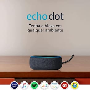 Echo Dot 3 Geração Smart Speaker com Alexa Assistente Preto Echo Dot 3 Geração Smart Speaker com Alexa Assistente Preto O Echo Dot é o smart speaker de maior sucesso. Controlado por voz com a Alexa, ele é perfeito para qualquer ambiente. Você pode pedir músicas, notícias, informações e muito mais. Além de ligar para amigos e familiares e controlar dispositivos compatíveis de casa inteligente com sua voz. Com 4 microfones de longo alcance, a Alexa ouve você do outro lado do cômodo. E com dispositivos Echo compatíveis em diferentes cômodos, você pode ouvir música em toda a sua casa. Use sua voz para acender as luzes, trancar as portas e muito mais com dispositivos de casa inteligente compatíveis. Tamanho: 43 mm x 99 mm x 99 mmPeso: 300 gramasConectividade: wifi Saída de áudio: Estéreo de 3,5 mm para uso com alto-falantes externos não incluso Fonte de energia: Bivolt 15W Inclusos na caixa: Echo Dot, carregador de energia bivolt 15W e Guia de início rápido. Homologação Anatel: 060792000160