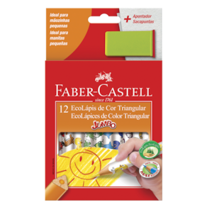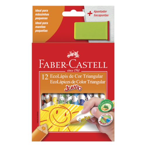 Deixe a criatividade fluir com os Ecolápis de Cor Jumbo da Faber-Castell. Os Ecolápis são formato Jumbo: ideal para mãos pequenas e estimula o desenvolvimento psicomotor das crianças. O formato triangular ergonômico dos Ecolápis garante conforto na pega, tornando o processo de aprendizagem muito mais divertido. Produzido com madeira 100% reflorestada e certificada pelo FSC: respeito ao meio ambiente. ATENÇÃO! Não recomendável para crianças de até 3 três anos, por conter parte s pequena s que pode m ser engolida s ou aspirada s . Produto atóxico e não perecível. Este produto pode ser reciclado. Vamos limpar o planeta juntos. Características: - Formato Jumbo: para mãozinhas pequenas - Estimula o desenvolvimento psicomotor - Ponta max resistente - Cores mais vivas - Madeira 100% proveniente de manejo florestal sustentável e certificado pelo FSC: respeito ao meio ambiente - Produto atóxico e não perecível Especificações Marca: Faber-Castell Modelo: Jumbo Código: 12.3024AP Cores: 12 Cores Produto contém: Estojo com 12 Ecolápis de Cor Jumbo + 1 Apontador Jumbo com depósito Registro Inmetro: 004417/2017 Sobre a Faber-Castell Líder mundial na produção de EcoLápis de madeira reflorestada, a história da Faber-Castell se confunde com a própria criação do lápis. Fundada em 1761 na Alemanha, hoje a empresa possui escritórios em mais de 100 países. No Brasil, onde está presente desde 1930, três fábricas São Carlos-SP, Prata-MG e Manaus-AM e 9.600 hectares de floresta cultivada também em Prata-MG são as responsáveis pela produção de 2 bilhões de EcoLápis por ano. Com mais de 70 mil postos de venda no Brasil, exporta também para mais de 70 países. Seu portfólio inclui: EcoLápis de cor e de grafite, giz de cera, tintas escolares, canetinhas hidrográficas, apontadores, borrachas, canetas, lapiseiras, kits criativos, produtos artísticos, instrumentos e acessórios de luxo para a escrita. Ean: 7891360447924
