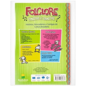 Benefícios: • Tema faz parte da prática pedagógica e está presente nas escolas, pois estimula o movimento e ajuda a desenvolver a fala (através das cantigas de roda). • Conteúdo relevante para os educadores inserirem nos planos de aula (como ponto de partida para o tema), promovendo diversas atividades lúdicas (musicalização, dança, relatos orais, cantigas de roda, etc) que estimulam a criatividade e a imaginação. • Apresenta os personagens mais conhecidos do folclore (Saci-Pererê; Bicho-Papão; Boitatá; Boto Cor-de-Rosa; Bumba meu Boi; Curupira; Iara; Lobisomem; Negrinho do Pastoreio; Mula sem Cabeça). • Ajuda a preservar a tradição e a cultura. Resenha: Histórias, Brincadeiras e Cantigas da Cultura Brasileira. . Trava-Língua . Parlenda . Advinha . Olho Vivo