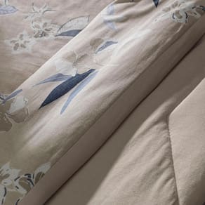 A estampa Kyoto combina a suavidade do bege mocha com flores e folhagens em tons de azul e cinza, criando um visual sofisticado e acolhedor para o quarto. Confeccionada em puro algodão de alta maciez, a coleção oferece edredom com enchimento em poliéster thermobonder leve, colchas com viés e porta-travesseiros no tamanho padrão com abas e acabamento em matelassado quadriculado, que mantém o enchimento bem distribuído e confere um relevo elegante. O jogo de cama completo traz lençol superior com dobra feita, lençol inferior com elástico que se adapta a colchões queen e king de até quarenta centímetros de altura e fronhas estilo envelope com viés e acabamento em rolotê. Já o jogo de cama simples é ideal para o dia a dia, com lençol de elástico e fronhas envelope sem abas. Uma coleção versátil que une conforto, praticidade e beleza em cada detalhe, perfeita para transformar sua cama em um refúgio acolhedor.