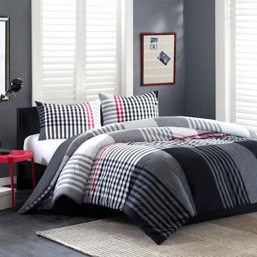 Disponível para camas: Casal King 1 edredom dupla face com enchimento 2,80x2,80cm - frente estampa geométrica mista abstrata, Tons de cinzas, branco e listras delicadas em vermelho ferrari - costas em cinza escuro. 2 capas de travesseiros de 70cm x 50cm sem enchimento - frente e costas estampa geométrica mista abstrata. Tons de cinzas, branco e listras delicadas em vermelho ferrari