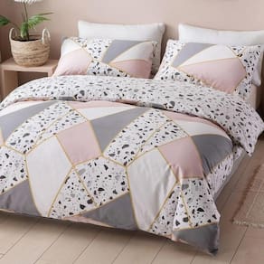 Disponível para camas: CASAL QUEEN 1 edredom dupla face com enchimento 2,60x2,60cm - Frente estampa geométrica mista abstrata, tons De dourado, cinza, branco e rosê - Costas estampa abstrata fundo branco e estampa em cinza. 2 capas de travesseiros de 70cm x 50cm sem enchimento - Frente estampa geométrica mista abstrata, tons De dourado, cinza, branco e rosê - Costas estampa abstrata fundo branco e estampa em cinza.
