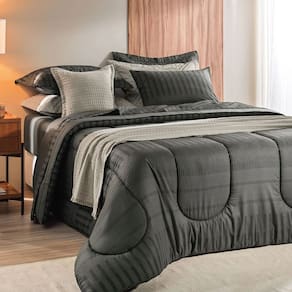 O Edredom Casal Tales, da Karsten traduz uma estética contemporânea e bem equilibrada, com listras discretas em tons grafite e preto que criam profundidade visual e deixam o quarto mais atual. O desenho geométrico é elegante na medida certa, fácil de combinar com diferentes estilos de cama posta, enquanto o toque macio do tecido proporciona uma sensação acolhedora desde o primeiro contato. A proposta dupla face permite variar o visual com praticidade, mantendo sempre uma aparência organizada e convidativa. No edredom Tales, o conforto vem aliado à funcionalidade, confeccionado em tecido 100% algodão com 160 fios, oferece boa respirabilidade e bem-estar ao longo da noite. O modelo conta com tratamento termobond, que contribui para uma melhor distribuição da manta e maior durabilidade da peça. Com medida de 2,20m x 2,40m, é ideal para camas de casal, garantindo caimento adequado e acabamento bem definido sobre a cama. Informações básicas: Marca: Karsten Referência: 3444563 Contém: 1 edredom Casal Características: Composição do tecido: 100% algodão 160 fios Composição do enchimento: 100 poliéster Medidas aprox.: 2,20m x 2,40m Informações técnicas: Garantia: contra defeitos de fabricação