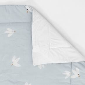 Características principais: - Tecido: 100% algodão de alta qualidade, garantindo suavidade e conforto. - Dupla face: Um lado com estampa de pássaros azuis e o outro em branco liso, permitindo versatilidade na decoração. - Enchimento: Manta de poliéster antialérgica, ideal para proteger e aquecer com segurança. - Tamanho: 2,20m x 1,45m, ideal para camas de solteiro.