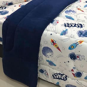 Sua estampa lúdica de astronauta desperta a imaginação e o desejo de explorar o universo. Além disso, a dupla face permite variar a decoração do quarto sempre que desejar, trazendo mais praticidade e versatilidade. Um edredom perfeito para envolver os sonhos em conforto e diversão!