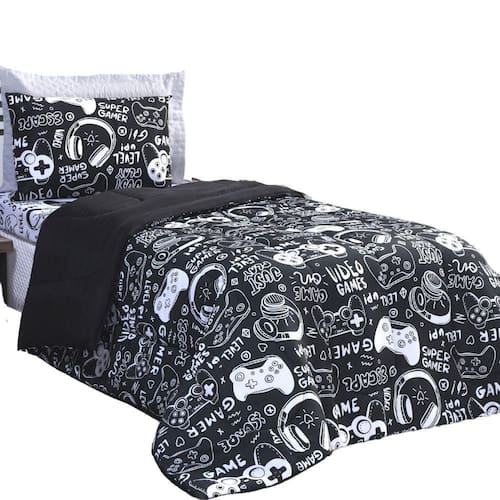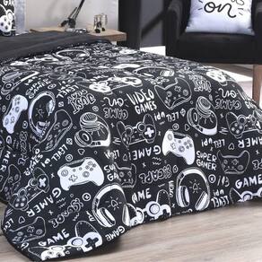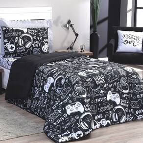 Edredom Preto Solteiro Micropercal 200 fios Menino Infantil Dupla Face Game 1 Pç O edredom solteiro avulso game foi produzido pensando no conforto e diversão do seu filho a . Sendo um item em dupla face um lado estampado e o outro liso possui duas versões diferentes em um só produto.