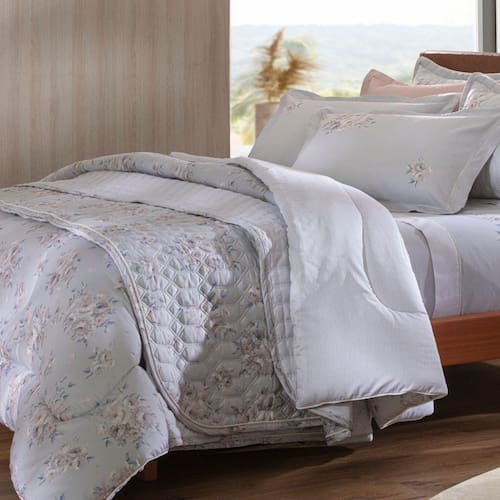 O Edredom Lázio Virginy, com seu luxuoso tecido de 300 fios de algodão egípcio e toque acetinado, é a escolha perfeita para quem busca o máximo de conforto e sofisticação. A delicada estampa floral em tons suaves traz uma atmosfera relaxante e refinada para o seu quarto.