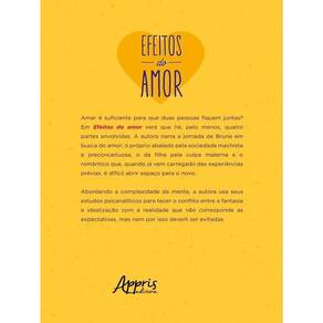 Amar é suficiente para que duas pessoas fiquem juntas? Em Efeitos do amor verá que há, pelo menos, quatro partes envolvidas. A autora narra a jornada de Bruna em busca do amor: o próprio abalado pela sociedade machista e preconceituosa, o da filha pela culpa materna e o romântico que, quando já vem carregado das experiências prévias, é difícil abrir espaço para o novo. Abordando a complexidade da mente, a autora usa seus estudos psicanalíticos para tecer o conflito entre a fantasia e idealização com a realidade que não corresponde as expectativas, mas nem por isso devem ser evitadas. Marca: Não Informado