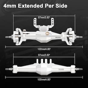 Especificações: Material da caixa: alumínio Material da engrenagem: liga de aço 20CrMo Material do eixo CVD: aço endurecido Relação da engrenagem: 24/12 = 2:1 (igual ao estoque) Comprimento total: 122 mm (4,80 polegadas) Peso do eixo dianteiro: 62 g (2,19 onças) Peso do eixo traseiro: 42 g (1,48 onças) - Abóbora em forma de diamante para uma aparência de escala mais realista. - Equipado com um servo-on-eixo, coloque um suporte servo que abaixa o centro de gravidade. - Aumente a largura de cada lado em 4 mm, proporcionando melhor estabilidade e desempenho de escalada. - Todos os eixos foram estendidos, não apenas os eixos dogbone, o que evita que os eixos dogbone fiquem sobrecarregados. - Vem com eixos CVD endurecidos, engrenagens de aço 12/24T, hexágonos e porcas de latão de 5 mm (+1 mm).