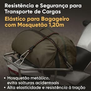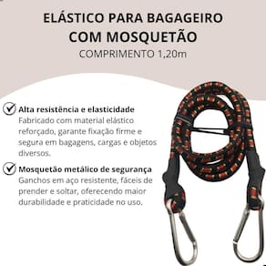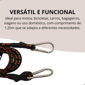 Produzido com material elástico de alta resistência e ganchos tipo mosquetão em metal, garante fixação firme e durável, evitando que os objetos se soltem durante o deslocamento.