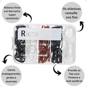 O Elástico Invisivéis Para Cabelo Ricca é super versátil e discreto, ideal para fazer penteados de todos os estilos. Perfeito para prender pequenas mechas de cabelos, o elástico é confeccionado em borracha super resistente e vem nas cores transparente, preto e marrom, camuflando-se nos fios. São ideais para prender os fios com firmeza e sem quebras, proporcionando um uso confortável ao longo do dia. Proporciona práticidade na hora do penteado. No total são 200 unidades e acompanham um case para guardar eles.