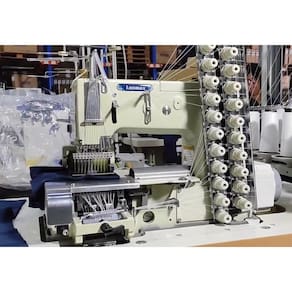 Elastiqueira plana de 12 agulhas com catraca, motor direct drive e um dispositivo zeromax frontal para aplicar fio de lastex para costurar franzidos ornamentais em blusas femininas, maiôs vestidos, fronhas e camisa infantil.