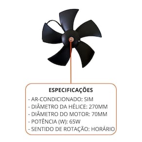 - ar-condicionado: sim - diâmetro da hélice: 270mm - diâmetro do motor: 70mm - potência w : 65w - sentido de rotação: horário