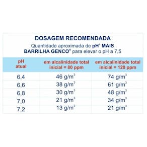 Instruções de uso:1 a quantidade de phmais barrilha gencoa ser utilizada depende de vários fatores além do ph. Baseie-se nas quantidades indicadas na tabela das fotos do anúncio: 2 adicione o produto diretamente da embalagem à piscina ou dissolva-o num balde plástico com água da própria piscina. Distribua o produto ou sua solução sobre a superfície da água de maneira uniforme. 3 mantenha a filtração ou recirculação da água em funcionamento durante cerca de 30 a 60 minutos para homogeneizar a solução. 4 teste o ph após uma hora, para certificar-se de que está correto. 5 só permita uso da piscina 30 minutos após aplicação do produto. Ean: 7897523132485