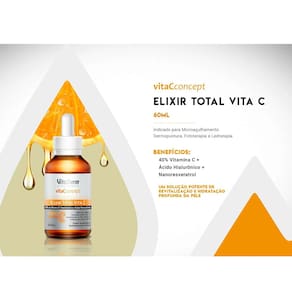 O Elixir Total Vita C possui altas concentrações de de vitamina C equivalente a 40% da Vitamina C pura para auxiliar na prevenção da perda da elasticidade e tônus da pele. Sua Composição aliada ao ácido hialurônico e ao nanoresveratol, ajudam a fornecer uma potente revitalização e hidratação. Contém também ácidos nanoencapsulados kójico, glicólico, mandélico, e lático para renovação da pele. Uso corporal e facial.