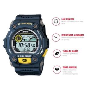 Descrição do produto G-7900-2dr - Gênero: Masculino - Garantia: 12 Meses com a fabricante - Composição Do Vidro: Vidro Mineral - Material Da Caixa: Resina - Cor Da Caixa: Azul - Material Da Pulseira: Resina - Cor Da Pulseira: Azul - Diâmetro Da Caixa: 50 Mm - Espessura Da Caixa: 14 Mm - Pressão: 20 Atm - Pode Lavar As Mãos: Sim - Pode Usar Em Água Corrente: Sim - Pode Usar Na Piscina: Sim - Resistência A Choques - Tábua De Marés (nível Da Maré Em Determinada Data E Hora) - Dados Lunares (duração Da Lua Do Dado De Entrada, Gráfico De Fases Da Lua) - Fundo Luminoso - Luz Automática Por Sensor, Duração De Luminosidade Selecionável, Persistência Luminosa - Alerta Piscante - Pisca E Soa Para Alarmes, Sinalização A Cada Hora, Alarme Do Cronômetro Regressivo - Resistente À Baixas Temperaturas (-20°c) - Hora Mundial – 29 Fusos Horários - Cronômetro De 1/100 Segundo - Cronômetro Regressivo - Calendário Automático (até O Ano 2099) - Formatos 12/24 Horas - Peso Total Da Caixa: 68,2 G