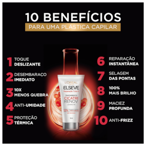 O Leave-in de Elseve L'Oréal Paris Reparação Total 5 Cicatri Renov realiza uma plástica capilar instantânea nos fios. Sua fórmula é enriquecida com Cicatri-Ceramida, responsável por selar as pontas e proporcionar muita maciez e brilho, enquanto desembaraça o cabelo imediatamente - seja ele seco ou misto. Um protetor térmico, sem enxágue, para qualquer hora ou lugar. O creme ainda é 10 em 1, e une benefícios de em um só produto: proteção térmica, reparação instantânea, anti-frizz, mais brilho, mais maciez, desembaraço imediato, toques liso, anti-umidade, 10x menos quebra e selagem das pontas.