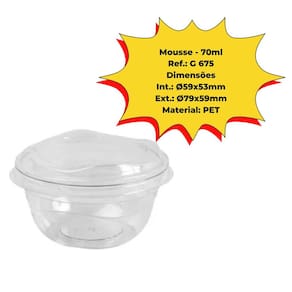 ESPECIFICAÇÕES: Modelo: G-675 Mousse 70ml Capacidade: 70 ml Quantidade: 500 unidades Material: PET cristal rígido, atóxico e reciclável Formato: Cilíndrico baixo com tampa articulada Tampa: Encaixe firme, vedação sem vazamentos Uso Indicado: Mousses, cremes, gelatinas, parfaits, pequenas porções Marca: PPLAST