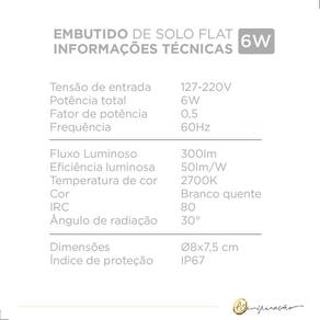 Tensão de entrada:127-220V Potência total: 6W Fator de potência: 0,5 Frequência: 60Hz Fluxo luminoso: 300lm Eficiência luminosa: 50lm/W Temperatura de cor: 2700K Cor: Branco Quente IRC: 80 Ngulo de radiação 30 Dimensões: 8x7,5 cm Índice de proteção: IP67 Marca: Não Informado