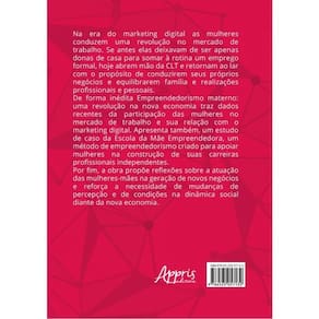 Na era do marketing digital as mulheres conduzem uma revolução no mercado de trabalho. Se antes elas deixavam de ser apenas donas de casa para somar à rotina um emprego formal, hoje abrem mão da CLT e retornam ao lar com o propósito de conduzirem seus próprios negócios e equilibrarem família e realizações profissionais e pessoais. De forma inédita Empreendedorismo materno: uma revolução na nova economia traz dados recentes da participação das mulheres no mercado de trabalho e sua relação com o marketing digital. Apresenta também, um estudo de caso da Escola da Mãe Empreendedora, um método de empreendedorismo criado para apoiar mulheres na construção de suas carreiras profissionais independentes. Por fim, a obra propõe reflexões sobre a atuação das mulheres-mães na geração de novos negócios e reforça a necessidade de mudanças de percepção e de condições na dinâmica social diante da nova economia.