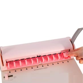 Perfura 12 folhas de tamanho A4 por vez e faz 12 furos ao mesmo tempo, com furos precisos sem necessidade de medir o espaço entre eles, aumentando a produtividade e precisão. Não possui régua de extensão, pois já faz 12 furos de uma só vez, com mais eficiência. Contém bandeja para encaixar os discos, facilitando e agilizando a aplicação e o aumento de páginas. Possui margeador para ajustar a perfuração conforme a quantidade de furos desejada.