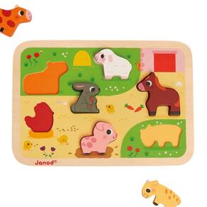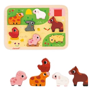 Com 7 peças tridimensionais em madeira representando os animais mais queridos da fazenda, cavalo, porco, galinha, coelho, vaca, ovelha e cabra, a criança aprende a reconhecer formas, animais e cores, enquanto desenvolve coordenação motora fina, percepção visual, raciocínio lógico e imaginação.