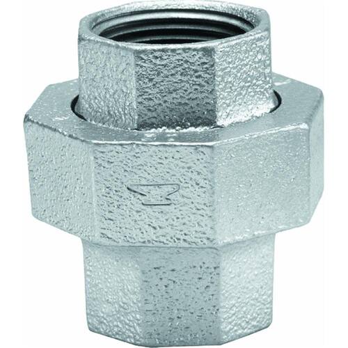 Junta de aterramento em ferro maleável preto e galvanizado. Assento de latão inserido. Para pressão de trabalho de até 150 libras de vapor ou 300 libras de água fria, óleo ou gás. Tamanho: 1-1/2 polegadas.
