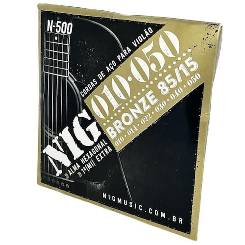 - contém 6 cordas em aço + 1 corda extra e mi + palheta - bordões cobertos em bronze 85/15 clássico Marca: Nig N500