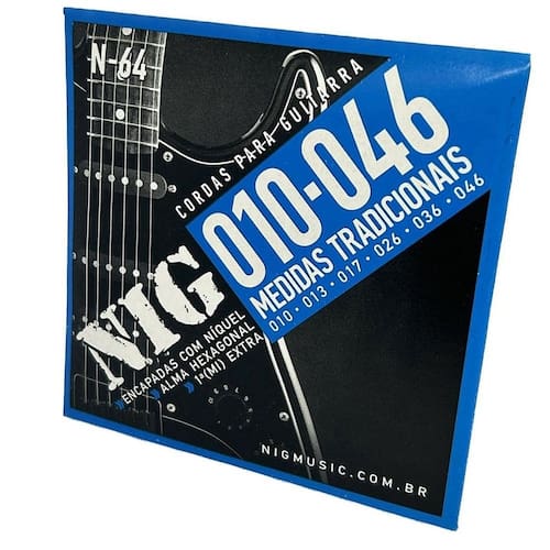 - tensão 10-46 - leve - encapadas com nickel - alma hexagonal - estanhadas e polidas - contém 6 cordas + 1 corda e mi extra + 1 palheta Marca: Nig N64