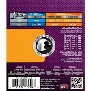 A quantidade de artistas que usam as cordas elixir é incontável, por isso se você nunca usou essas cordas com certeza você deveria experimentar. Difícil vai ser você voltar a usar as outras marcas phosphor bronze. As conceituadas cordas phosphor bronze são formadas basicamente de 92% de cobre + 7% de estanho e 1% de fósforo e por esse motivo têm um som um pouco mais quente e aveludado do que cordas de bronze. Sendo assim também um pouco menos brilhantes. Essas cordas tendem a serem um pouco mais duráveis do que as cordas de bronze convencionais. Phosphor bronze é como bronze regular, mas tem uma pequena quantidade de fósforo adicionado a liga que compõe a corda. O fato de ter fósforo na liga ajuda um pouco na durabilidade deste tipo de corda. Marcas comuns: