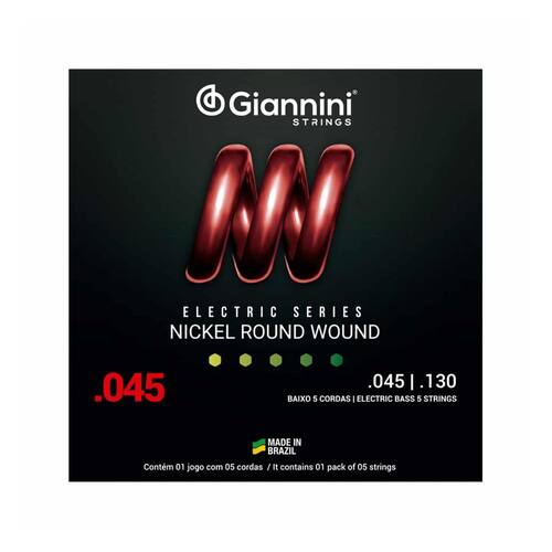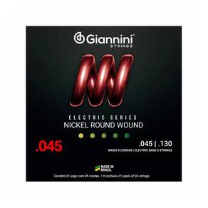 Encordoamento Giannini P/Contra Baixo Pesado 0.045 GEEBRS/5 A série Electric traz toda a sonoridade dos encordoamentos Giannini para a sua guitarra e contra-baixo. O encordoamento para baixo 05 cordas Giannini GEEBRS5 é composto de um núcleo de aço revestido por Níquel. O Níquel produz um som brilhante e agressivo que atende uma grande variedades de estilos musicais, sendo bem resistente a oxidação e corrosão. Jogo de 5 cordas para Contrabaixo.Marca: GianniniSérie: EletricFabricação: BrasilTensão: PesadoAlma: Aço