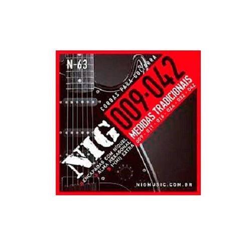 As Cordas NIG para Guitarra N-63 possuem alma hexagonal e são revestidas com liga importada de níquel com calibre inicial 09 ideal para a maioria das instrumentos. São fabricadas com os seguintes calibres:prata MI(E) .009 (0.23mm)roxa SI(B) .011 (0.28mm)verde SOL(G) .016 (0.41mm)preta RÉ(D) .024 (0.61mm)vermelha LÁ(A) .032 (0.81mm)dourada MI(E) .042 (1.07mm) 1 jogo com 6 cordas + 1 (mí) extra + 1 Palheta