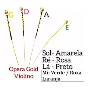 Neto violinos e acessorios musicais ltda As cordas ópera gold, mais um produto da marca ópera que se consagrou no mercado pelo sucesso de vendas do modelo ópera dominate, agora promete destacar-se novamente com o modelo soft gold. São produzidas com prata, alumínio e tungstênio - apenas a corda mi é em aço. Este modelo é ideal para músicos que preferem um tom aveludado e doce, com qualidade, ou seja, sem abafar o som do instrumento ou produzir chiados. Características: - tensão média - excelente resposta - confere som aveludado - som limpo e claro - ótima durabilidade - excelente para músicos de todos os níveis - fixador: bola - produto Mi verde Lá preto Ré rosa Sol amarelo Duvidas Pergunte no campo de perguntas do vendedor: 3 meses Marca: Não Informado