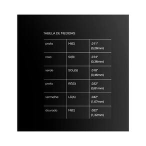 Prata MI (E) .011 (0,28 mm)Roxa SI (B) .014 (0,36 mm)Verde SOL (G) .018 (0,46 mm)Preta RÉ (D) .032 (0,81 mm)Vermelha LÁ (A) .042 (1,07 mm)Dourada MI (E) .052 (1,32 mm)