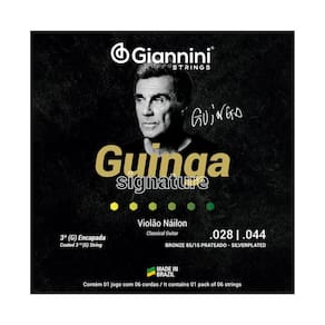 Com todo esse expertise, Guinga é exigente com o som do seu violão. Em parceria com a Giannini, desenvolveu o encordoamento Signature Guinga, revestido com Bronze 85/15 prateado e que traz a sua 3° corda encapada.