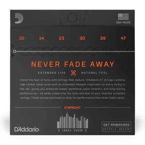 A estrutura das cordas com núcleo hexagonal de aço de alto padrão, revestimento em fósforo-bronze com película adicional protetora (XS Film) garante maior resistência a roturas e timbre durador.
