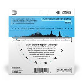 Encordoamento Violão Aço 11-47 D Addario Silk & Steel Ej40 [f035] Excelentes para violões de pequeno porte e preferidas de muitos músicos folk, as cordas Silk & Steel são projetadas e medidas especificamente para violonistas que usam o estilo dedilhado tradicional e preferem um timbre quente e suave. Cordas produzidas com alma de seda e enrolamento de cobre com banho de prata, proporcionando fácil digitação e timbre aveludado. Unidades por Embalagem:1 Gênero:Unissex Material:Aço + Seda Linha:SILK & STEEL Calibre da Corda:.011 .014 .023 .028 .038 .047 Tipo de Corda:ROUNDWOUND Quantidade de Cordas:6 Tensão:Leve Código Universal do Produto:19954952167 Marca:D Addario Modelo:EJ40 SKU:017508