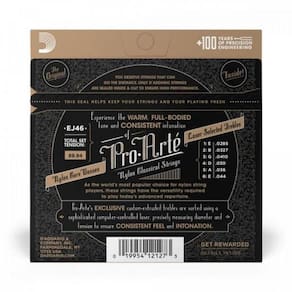 Encordoamento Violão Nylon Tensão Alta Pro-arte Nylon Core Ej46 D Addario [f002] O Encordoamento Para Violão D Addario EJ46 é um modelo conhecido pela sua qualidade. Desenvolvidas em nylon revestido de prata produzem um som penetrante, equilibrado com um timbre insuperável. Além de garantir maior durabilidade. Atendendo assim, os requisitos dos mais conhecidos padrões de afinação, acertando em cheio no gosto dos músicos mais exigentes. Sendo assim, primeira opção entre os maiores profissionais do ramo. Aplicação:Violão clássico Tensão:.029 - .044 - Pesada Material:Nylon