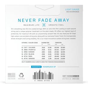 Instrumento Recomendado:Violão Aço Linha:XS 80/20 Bronze Unidades por embalagem:3 Quantidade de cordas:6 Calibres:0.012, 0.016, 0.024, 0.032, 0.042, 0.053 Materiais:Aço/Bronze Tensão:Leve Notas:E, B, G, D, A, E Escala:N/A Origem:Estados Unidos Gênero:Unissex