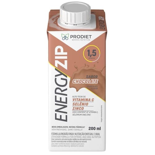 DESCRIÇÃO: Energy ZIP é uma nutrição oral de alto teor calórico e proteico, enriquecida com vitaminas e minerais, essencial para recuperação nutricional. Indicado como reforço nutricional e pacientes oncológicos. Isento de Fibras, zero glúten, zero lactose. Manusear conforme as orientações do a médico a e/ou nutricionista Distribuição calórica por embalagem PT 15% 11,4 g/ 200ml CH 55% 40 g/ 200ml LIP 30% 10,2 g/ 200ml densidade Calórica - 1,5 kcal/m Fonte de Proteína 55% Caseinato de Cálcio 30% Proteína Isolada de Soja 15% Proteína Isolada do Soro do Leite Fonte de Carboidrato 71% Maltodextrina 29% Sacarose Fonte de Lipídeos 66% Óleo de Canola 34% Óleo de Milho Informações Extras PERFIL LIPÍDICO Ác. Graxos Saturados: 3% Ác. Graxos Monoinsaturados: 14% Ác. Graxos Poli-insaturados: 13% OSMOLARIDADE: 567 mOsm/L H2O Marca: Prodiet Indicação de uso: Nutrição