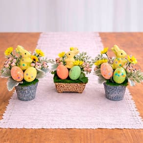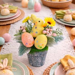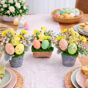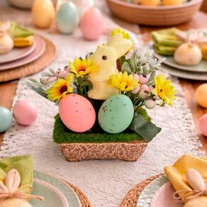 Deixe sua casa ainda mais charmosa nesta Páscoa com estes lindos arranjos decorativos. Ideal para centro de mesa, aparador, bancada ou prateleira, o arranjo traz um delicado coelho acompanhado de ovos decorativos, criando um clima alegre e acolhedor para a data