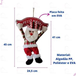 Características: - Material: Algodão PP, poliéster e EVA - Medidas: 41 x 24,5 cm - Conteúdo da embalagem: 1 enfeite de porta Papai Noel Ean: 7908573406256