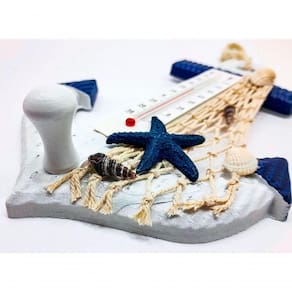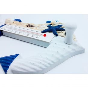 Material: Mdf, Plastico e Cordas; Cor: Azul Escuro e Branco; Decoração: Termometro; Estrela do Mar; Conchas e Rede; Alça Plastita; Medidas: