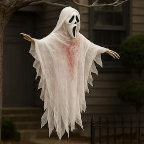 Decoração assustadora perfeita para o Halloween Este fantasma pendurado possui 46cm de altura, com tecido branco esfarrapado manchado de vermelho, criando um efeito arrepiante. A máscara estilo grito e as mãos esqueléticas adicionam realismo e impacto visual à peça.